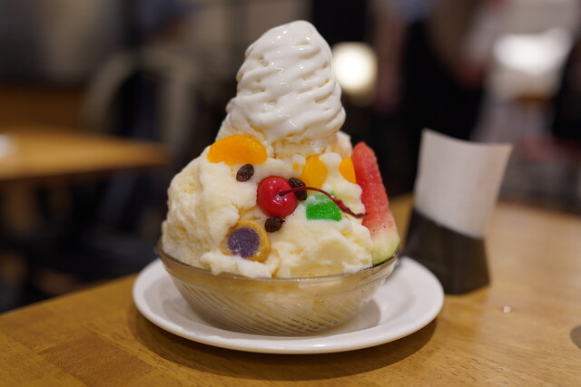 氷に練乳をかけフルーツなどを飾ったかき氷