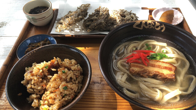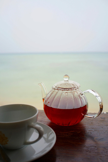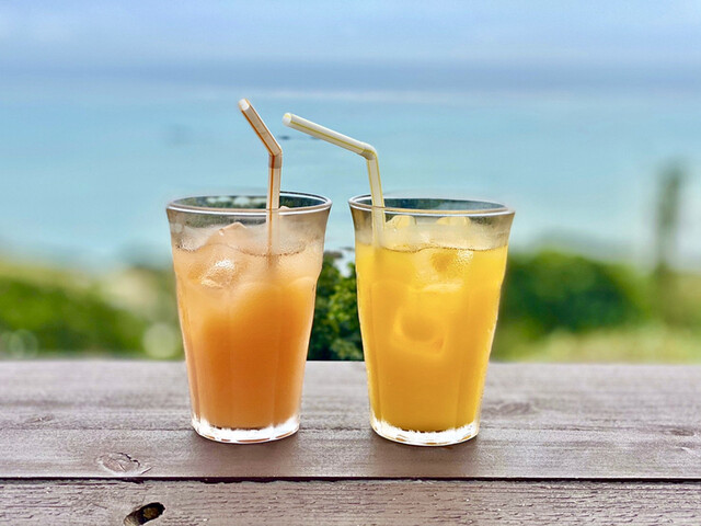 浜辺の茶屋を訪れると、入り口にいるシーサーが出迎えます。お店は屋上のテラス席、カフェ店内、ビーチのテラス席があります。店内の外観は木造りで、素朴な雰囲気を演出してくれます。席数が少なくこじんまりとしているので、木造りの外観とあいまってどこか隠れ家のような空気も感じさせます。ビーチには茅葺きの屋根があり、椅子スペースで飲食することができます。