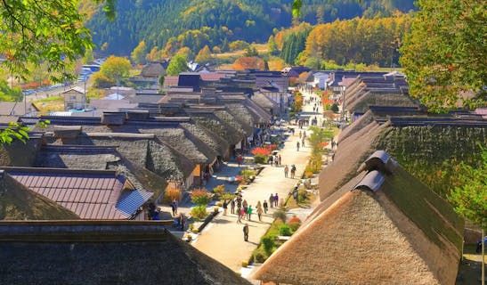 大內宿的街道被山包圍,兩旁是茅草屋頂的民居。這個江戶時代的宿場町風景,保留了強烈的氛圍,彷彿讓人時光倒流。在約500米長的「古民家街」上,體驗江戶時代旅人的心情。道路兩旁有各種商店,推薦您在感受當時的氛圍時,尋找美食和紀念品。